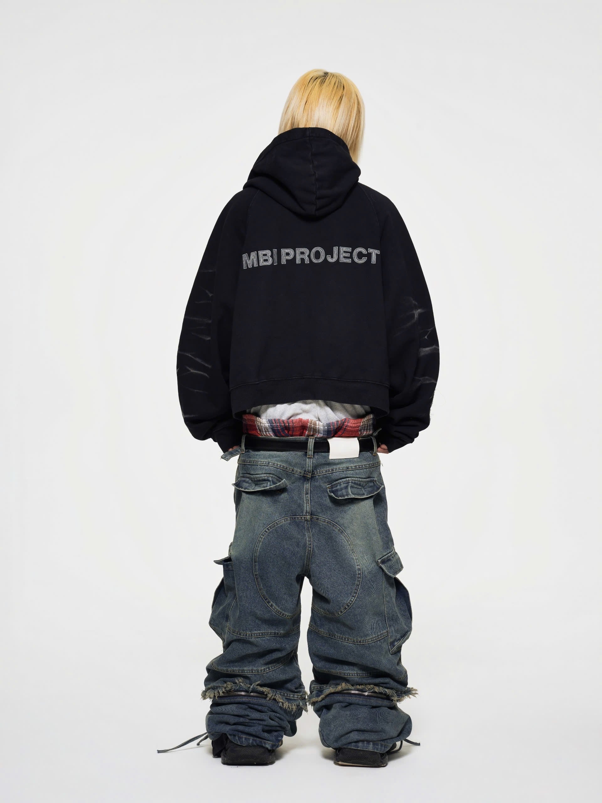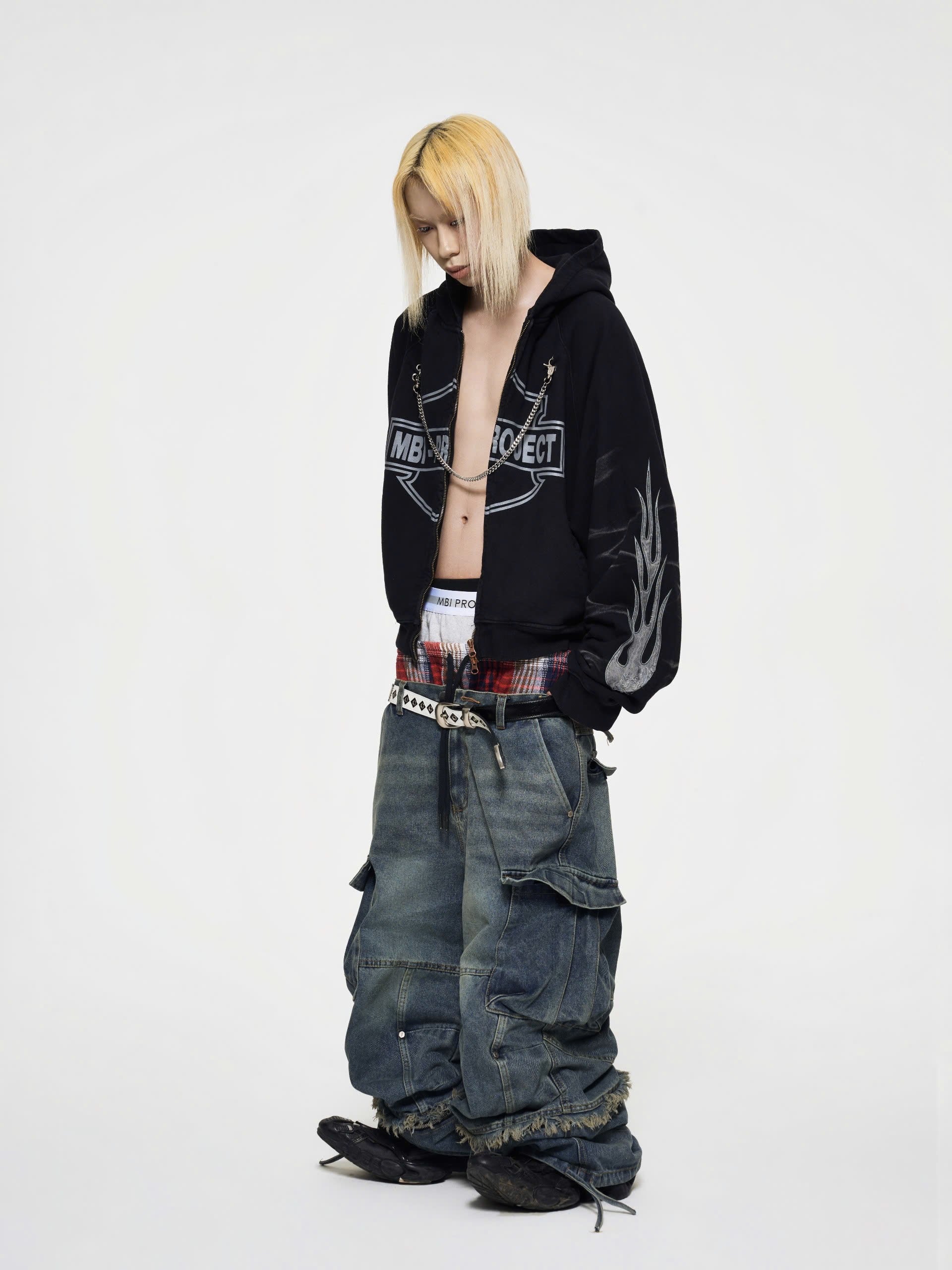 - Details: fabric is dyed, silver wash, cat whisker wash, silk-screen printed front, 2 hand-embroidered fabric patches, natural torn fabric, embroidered fabric patch on the back, 2 YKK zipper ends, thick cuffs, signature chain to keep the shirt in shape when opening the zip.