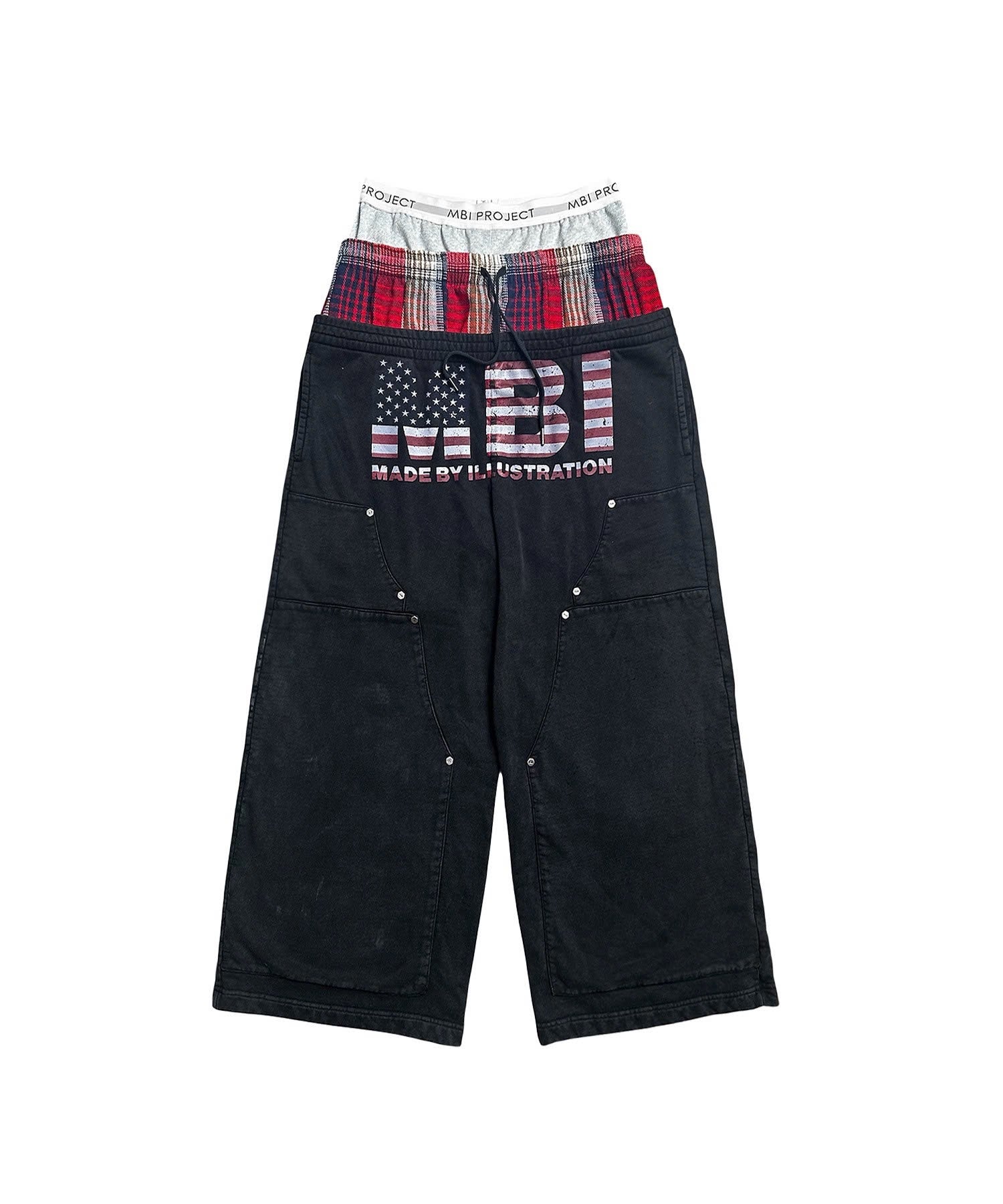 - Details: The design is based on 3 pairs of pants stacked on top of each other to create many layers (underwear, plaid pants, thin pants), MBI PROJECT woven pants layer, plaid pants layer with adjustable waistband, inner floral pants layer with silk pull signature logo, double knee details, MBI rivet logo, color wash and processed.
